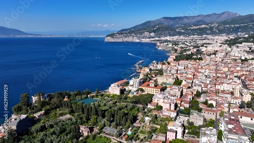 © bydronevideos, Naklejka premium Sorrento Skyline In Naples Campania Italy. Bustling Downtown Cityscape With Modern Buildings. Shore Clouds Sky Beach Sea. Seaside Panorama. Naples Campania.