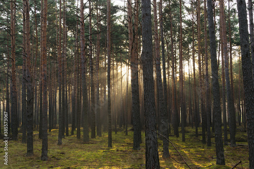 Obraz premium Sosnowy las osnuty poranną mgłą.