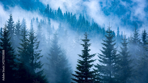 © Pavlo Klymenko, Fototapeta premium sosnowy las w błękitnej mgle