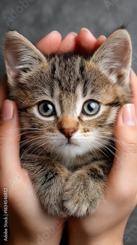 © phankii, Obraz premium Soulful Gaze of a Tabby Kitten Cradled in Gentle Hands.