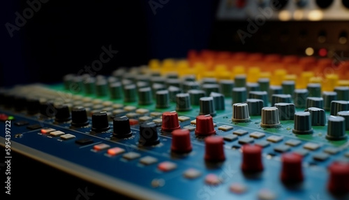 © Stockgiu, Obraz premium Sound engineer adjusts equipment knobs for perfect balance generated by AI
