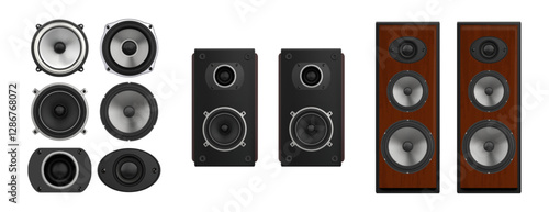 Fototapeta premium Sound speaker. 3D music box. Stereo system or audio loudspeaker for home theater. Boom loud acoustic. Disco electronic equipment. Woofer player. Vector isolated boombox elements set