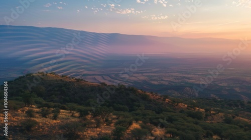 Fototapeta premium Sound waves radiating across a serene landscape, symbolizing the interconnectedness and harmony of natural and auditory elements.