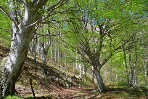 Fototapeta premium Sous bois et forêt de hétres de montagne avec ciel bleu