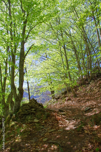Obraz premium Sous bois et forêt de hétres de montagne avec ciel bleu