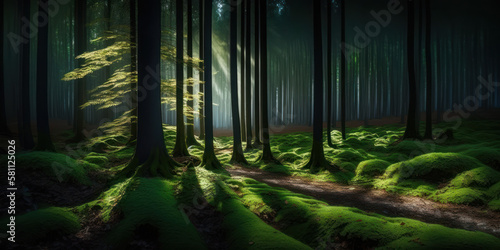 © Studio Zenith, Naklejka premium sous bois humide avec mousse et fougères, forêt sauvage et obscure, végétation dense