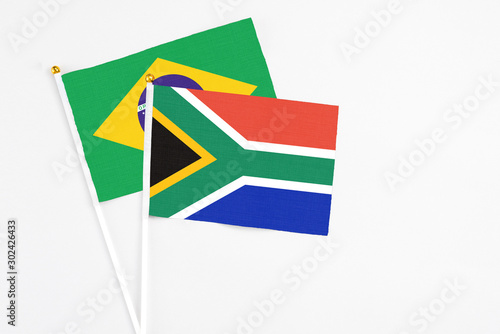 Fototapeta premium South Africa and Brazil stick flags on white background. High quality fabric, miniature national flag. Peaceful global concept.White floor for copy space.