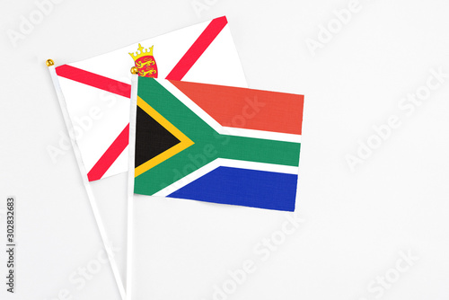 Fototapeta premium South Africa and Jersey stick flags on white background. High quality fabric,...