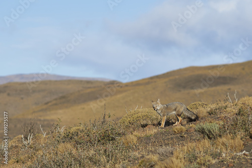 Naklejka premium South American Grey Fox (Lycalopex fulvipes) on a hillside in Torres del Paine National Park in the Magallanes region of southern Chile.