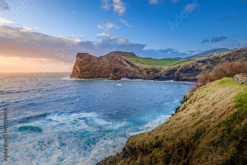 © ikuday, Fototapeta premium South coast of Sao Jorge (Azores islands) near Velas with volcanic rock Morro de Lemos. Breathtaking view of the dramatic cliffs and turquoise waters of Sao Jorge, Azores.
