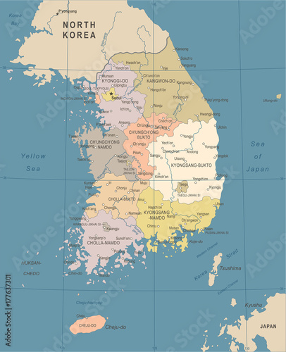 © Porcupen, Fototapeta premium South Korea Map - Vintage Vector Illustration