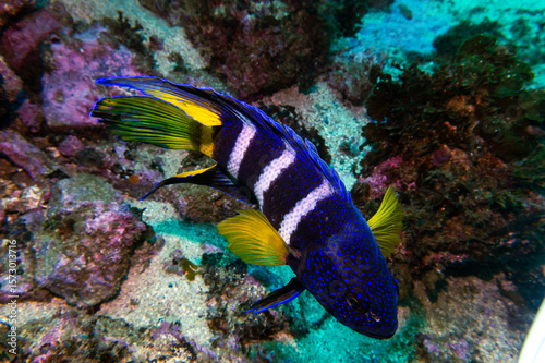 © Jairo, Fototapeta premium Southern Blue Devil (Paraplesiops meleagris) Displaying its Vibrant Electric Blue and Iridescent Spots in a Rocky Reef Cave along the Southern Coast of Australia
