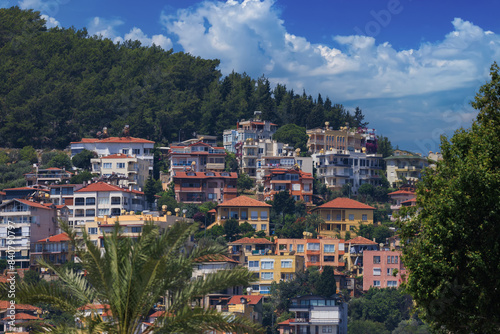 Obraz premium Southern cityscape, view of buildings and houses with green plants in public places in Turkey, sunny summer day in the city of Istanbul