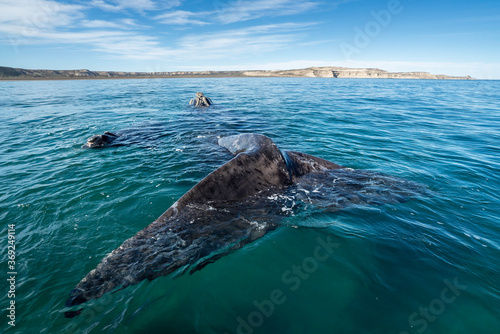 Naklejka premium Southern Right Whale, Eubalaena australis, and her young calf in the shallow protected waters of the Nuevo Gulf, Valdez Peninsula, Argentina, a UNESCO World Heritage site.