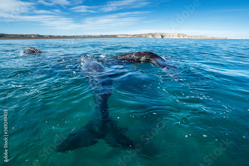 Obraz premium Southern Right Whale, Eubalaena australis, and her young calf in the shallow protected waters of the Nuevo Gulf, Valdez Peninsula, Argentina, a UNESCO World Heritage site.