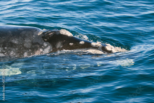 Obraz premium Southern right whale passing very near the camera so only a detail of the head is visible; the callosities (rough calcified skin patches) on the head, characterising right whales, are clairly visible