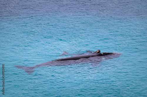 © Alba, Obraz premium Southern right whales. Couple cow and calf swimming on the surface of the ocean. Isolated individuals. Nursing area at Head of Bight, Nullarbor, South Australia