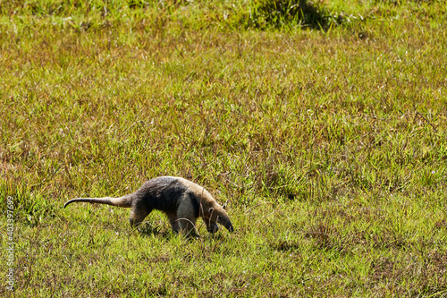 Naklejka premium southern tamandua, Tamandua tetradactyla, also collared anteater or lesser anteater, is a species of anteater from South America, foraging on a meadow in the southern Pantanal, Brazil