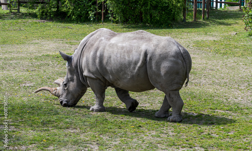 Naklejka premium Southern white rhinoceros walks in the meadow