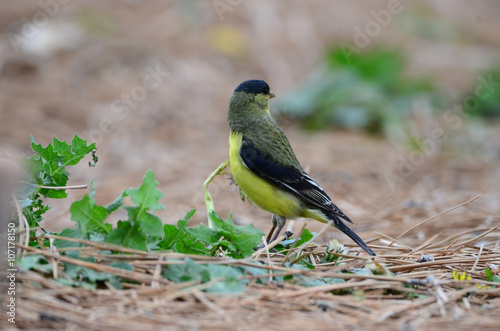 © RWKClark, Fototapeta premium Southwest USA Beautiful Yellow and Black Male Lesser Goldfinch are bright yellow below with glossy black cap white patches in wings, they have a black tail white corners.