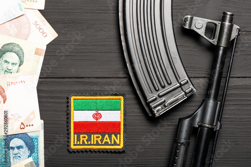 © Alexeiy, Obraz premium Soviet automaton AK 47 against the backdrop of Iranian money depicting Ruhollah Khomeini and Iranian flag