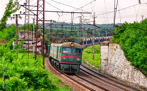 Naklejka premium Soviet-built electric locomotive hauling a freight train near Siversk, currently an active war zone in Russo-Ukrainian War in Donetsk region of Ukraine