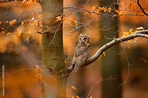 Fototapeta premium Sowa w pomarańczowym lesie, żółte liście. Uszatka z pomarańczowymi liśćmi...