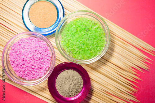Naklejka premium Spa concept. Pink and green salt inside the glass. Blue and red clay. Top...