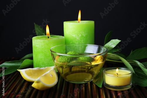 Obraz premium Spa still life in green color on bamboo mat, closeup