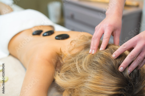 Fototapeta premium spa therapist is placing hot stone on to women back