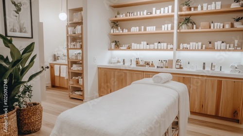 Fototapeta premium Spa Treatment Room with White Towels and Wooden Cabinets