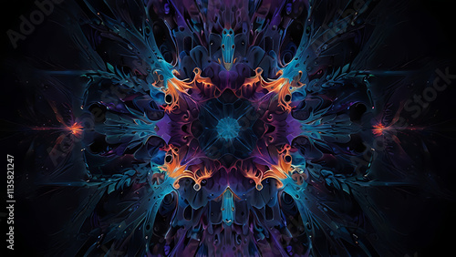 © Moeen, Obraz premium Space abstraction. Multicolored spheres are illuminated by flashes of blue light and are located against a black background. 3D render.