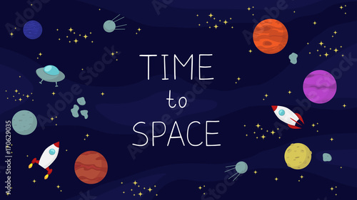 Fototapeta premium space background with planets, stars, spaceships and inscription "time to...