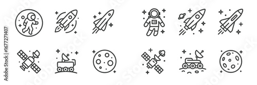 Naklejka premium Space exploration icons: astronaut, rockets, satellite, rover, moon