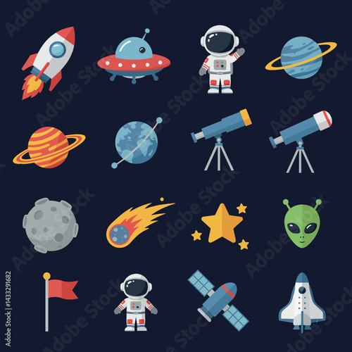 © GMZ, Naklejka premium Space exploration icons with rocket astronaut alien telescope and planets vector set