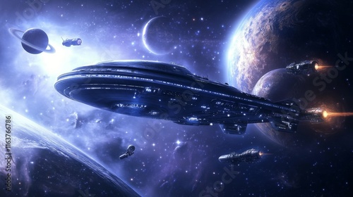 Obraz premium Space exploring icons, planets, rocket or shuttle, telescope, alien ufo with...