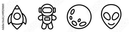 Fototapeta premium Space icons set. Astronaut, rocket, moon and alien. Vector silhouette....