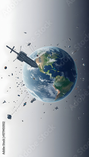 Fototapeta premium Space junk (pollution) orbiting earth, one line art, with white tones