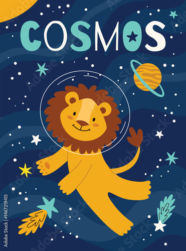 Fototapeta premium Space kids poster.Animal astronauts in among the stars and comets,lion.A postcard, a flyer, an invitation.Vector cartoon flat illustration.