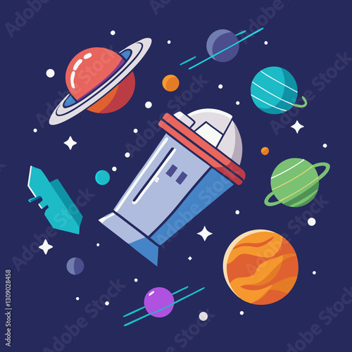 Naklejka premium Space mission vector illustration with planets and spacecraft, A vector illustration of a space mission, featuring planets, a spacecraft, and cosmic elements set against a dark blue background.