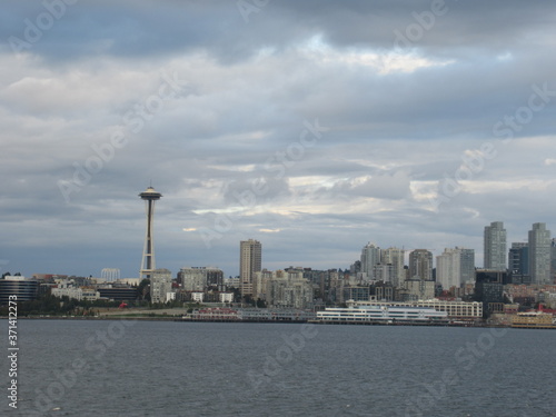 © Jarmo, Fototapeta premium Space Needle and part of Seattle skyline seen from the sea on a cloudy evening.