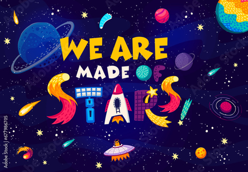 Naklejka premium Space quote. We are made of stars words in starry galaxy vector background with cartoon planets, UFO and rocket. Fantasy space with inspiration phrase, alien character, spaceship, satellite and comets