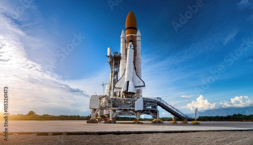 Obraz premium Space Rocket Ready for Launch, Realistic Panoramic Close-Up of Sky Background