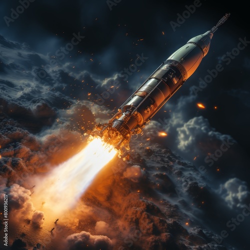 © Ai-Pixel, Obraz premium Space shuttle rocket in deep space with clouds and Earth planet.