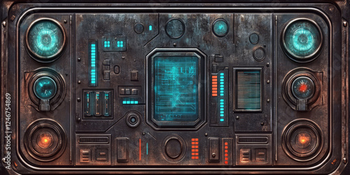 Fototapeta premium Space station metal wall background with futuristic design, glowing control panels.