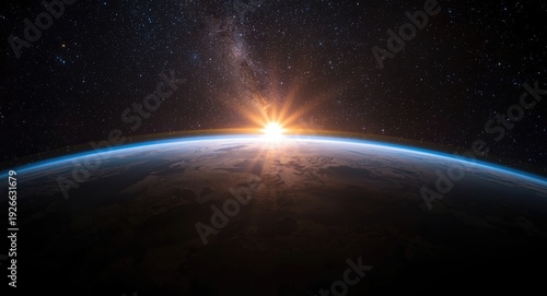 © vxnaghiyev, Fototapeta premium Space view of Earth's sunrise with twinkling stars and distant galaxy