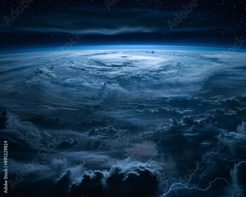 Fototapeta premium Space view of thunderstorms, cyclones, catastrophic lightning, weather...