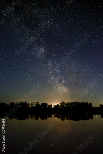 Fototapeta premium Space with stars in the night sky. The landscape with the river and trees is photographed on a long exposure.