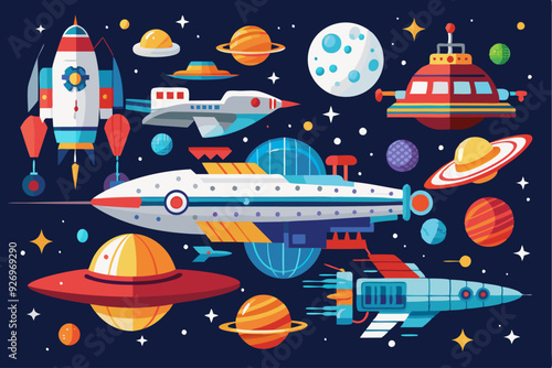 © Design Crea, Naklejka premium Spacecraft and Planets in a Dark Blue Galaxy