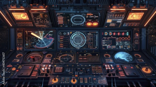 Obraz premium Spacecraft Control Panel in 3D Vector Style, illustrating advanced navigation...